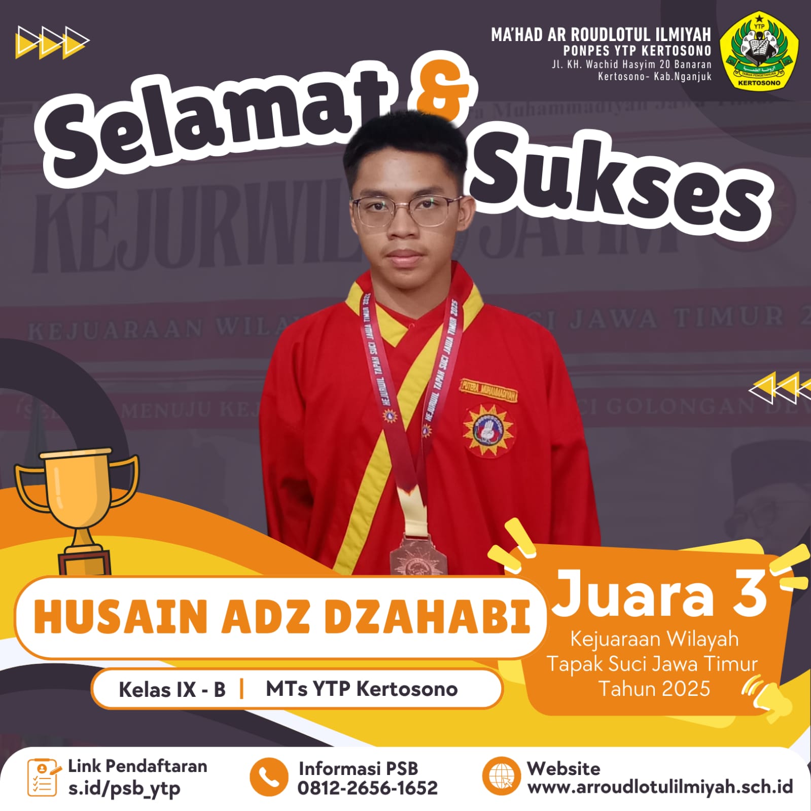Tidak kalah membanggakan, Husain Adz Dzahabi, siswa kelas IX-B, juga berhasil meraih podium dengan meraih Juara 3. Keberhasilannya ini tentu menjadi motivasi tersendiri bagi Husain dan juga siswa-siswa lain di MTs YTP Kertosono untuk terus berprestasi.